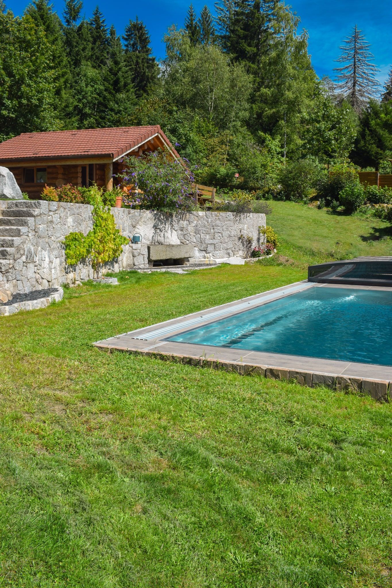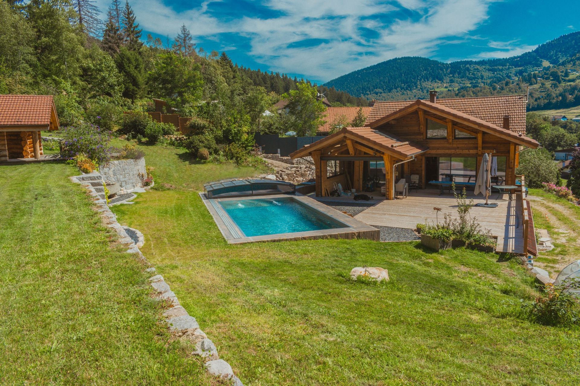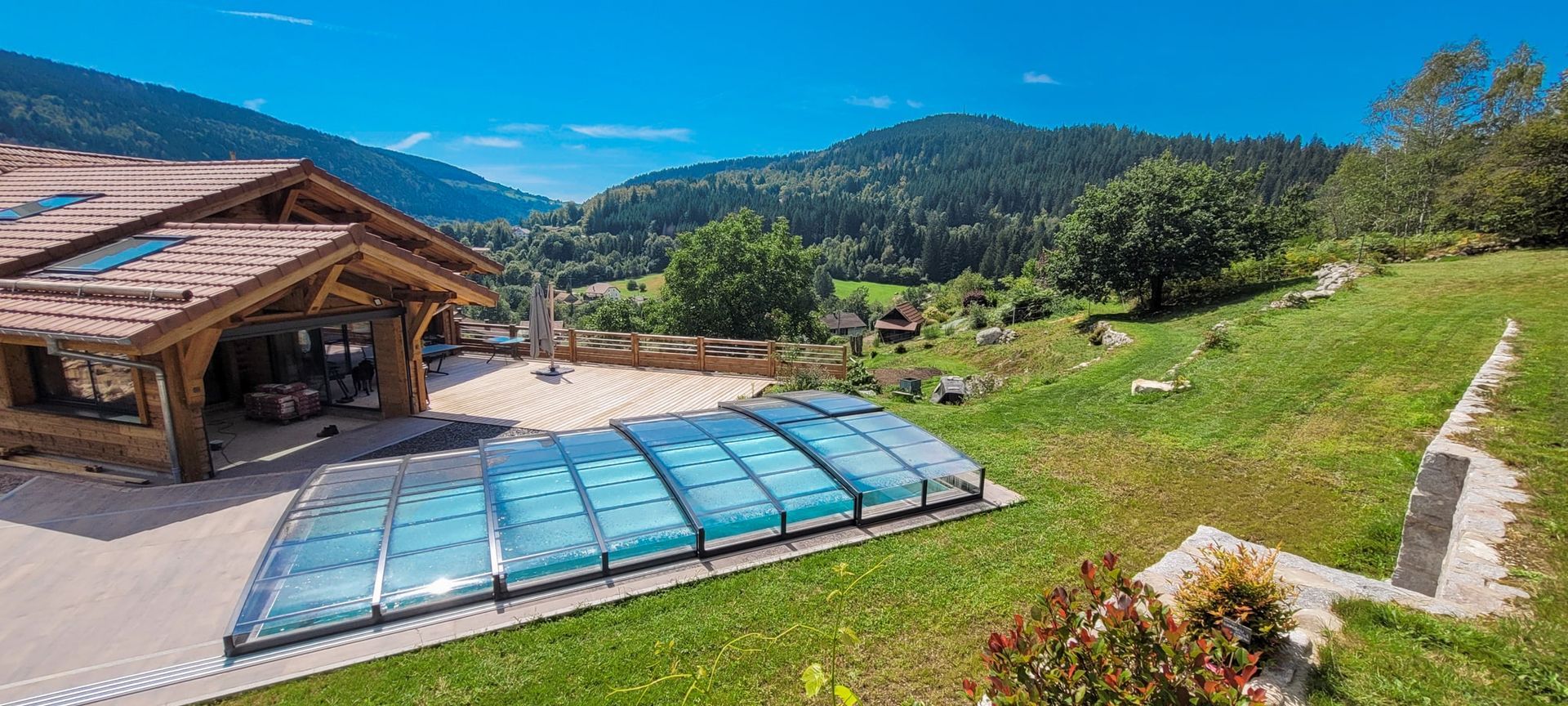 L'élégance intemporelle du revêtement en inox pour la piscine s'harmonise parfaitement avec le charme rustique et chaleureux d'un chalet en bois niché au cœur des montagnes.